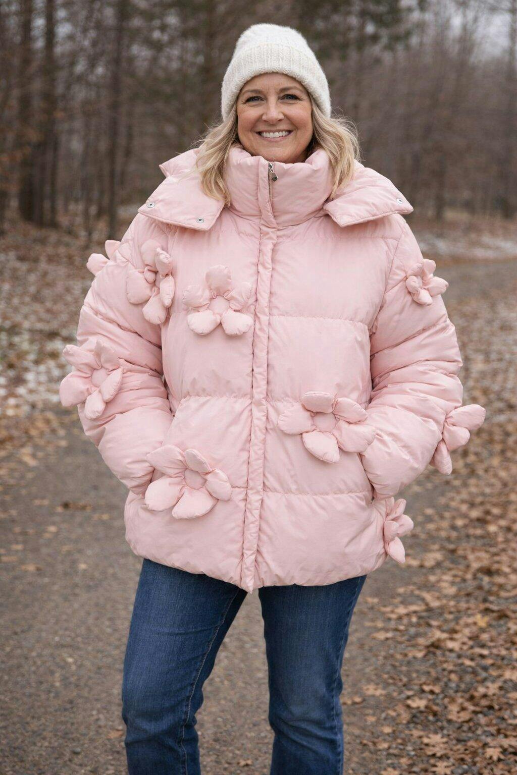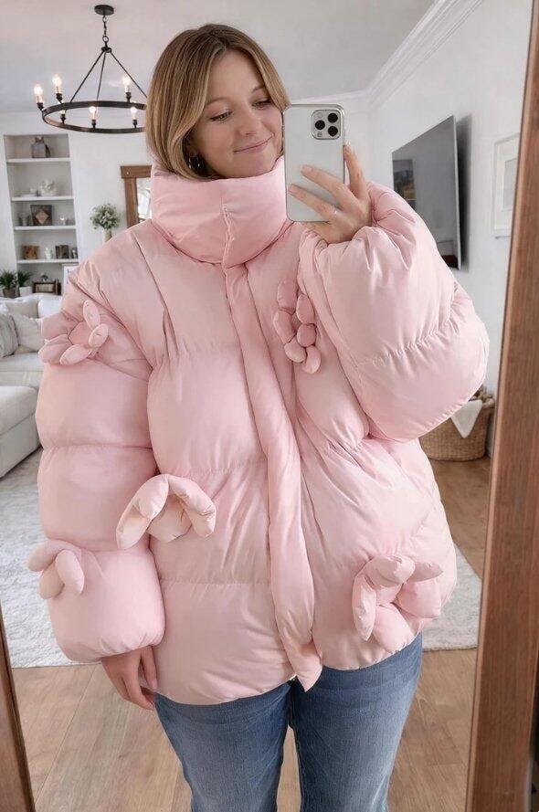 This oversized, cloud-soft puffer coat features a pastel pink hue with oversized puff panels and playful pom-pom-like accents at the sleeves. The wrap-tie waist creates a flattering silhouette while keeping you warm and stylish for winter days.