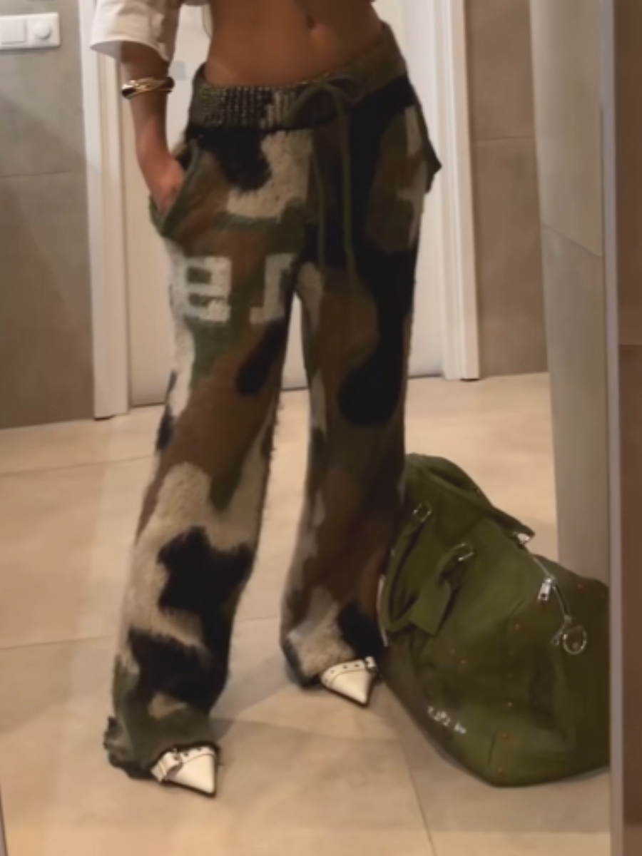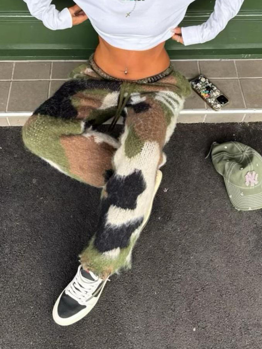 Cozy, oversized jogger pants in a multi-color camouflage pattern. Crafted from plush fleece with an elasticated drawstring waistband and ribbed cuffs for a relaxed, street-ready silhouette. Perfect for lounging or casual outings when paired with a cropped top or hoodie.
