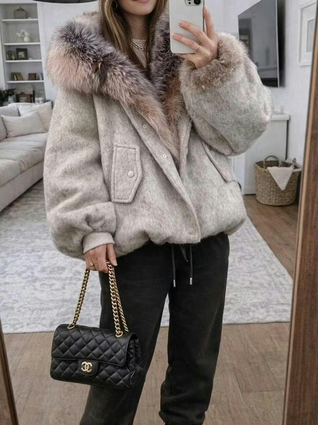A luxurious oversized coat crafted from soft, textured material with a dramatic fur-trimmed hood and contrasting fur accents along the front. The relaxed silhouette, large flap pockets, and subtle hardware create a chic, statement winter look.