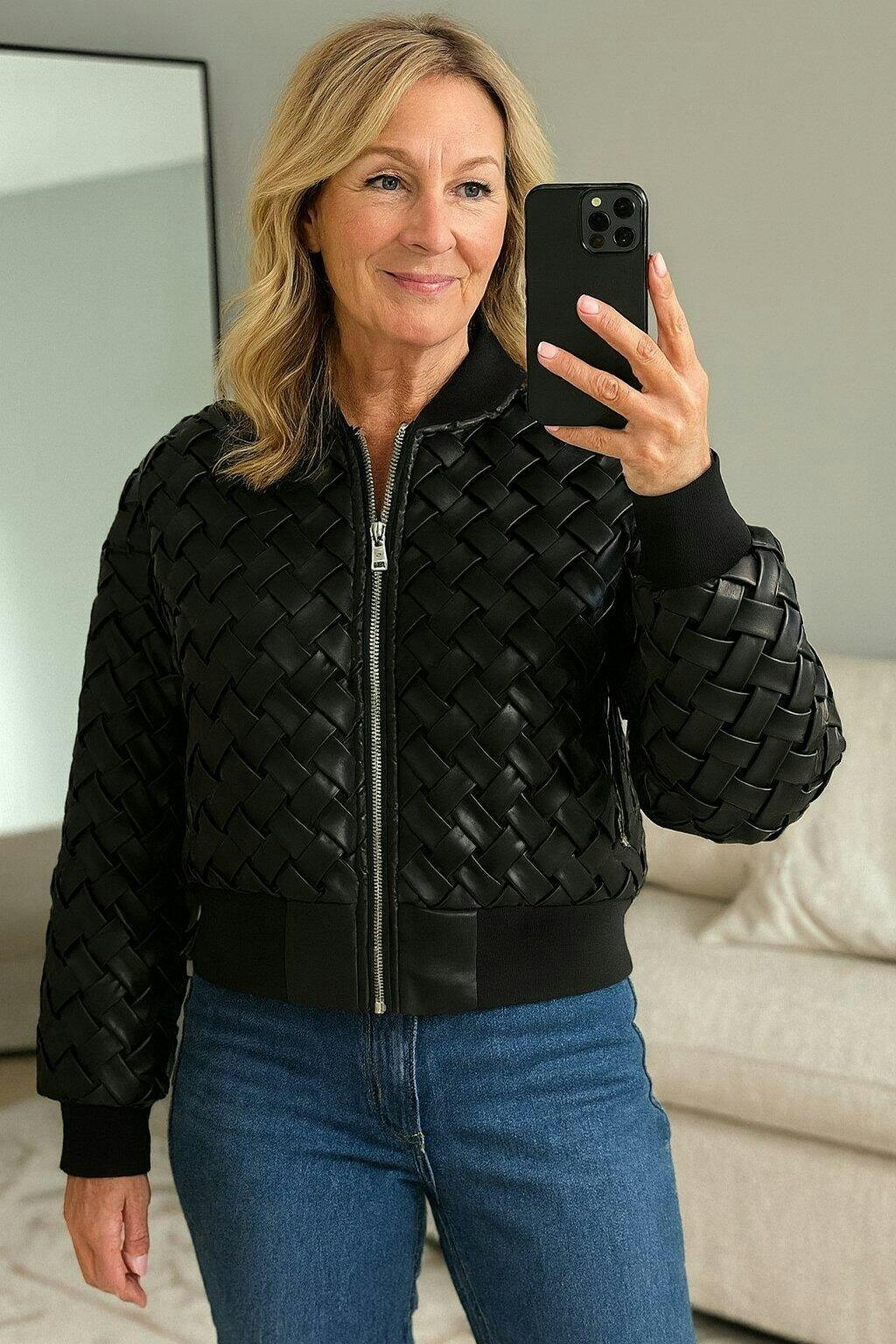 A bold black quilted bomber-style jacket with a chunky woven texture. It features a front zipper, ribbed cuffs and hem, and a sleek, cropped silhouette for a modern, edgy look.